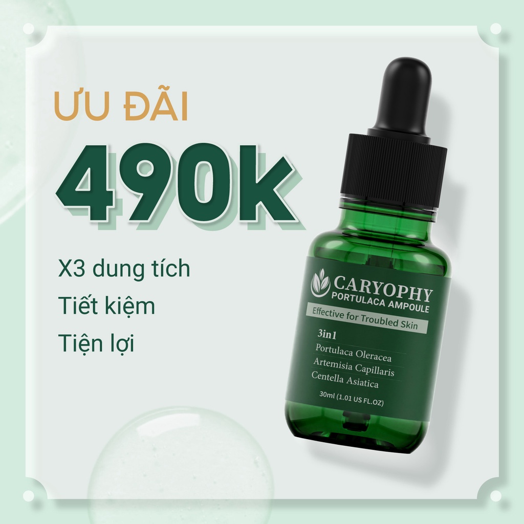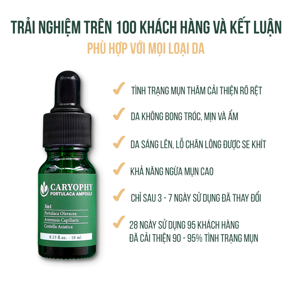 ✔️ Serum Caryophy Portulaca Ampoule trị mụn trị thâm với các thành phần lành tính 100% từ thiên nhiên an toàn phù hợp với mọi loại da: Da thường, Da dầu, Da hỗn hợp, Da khô, Da nhạy cảm, Da mụn.