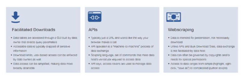 Tải xuống có hỗ trợ (Facilitated Downloads): Dữ liệu được trình bày trong các bảng và bạn có thể truy cập trực tiếp thông qua một giao diện người dùng (GUI) do chủ sở hữu dữ liệu cung cấp. Bạn chỉ cần nhập các thông số cần thiết để lấy dữ liệu